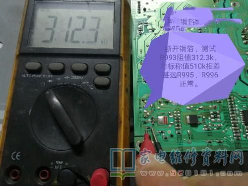 海信LED32K311液晶电视黑屏的故障维修 2022-03-01 17:27:28 阅读 744 次 评论 0 条 摘要: 接修一台海信LED32K311电视,故障表现为黑屏有声音,这次检修时走了弯路,不是灯条故障,是恒流板背光电压检测电路故障,R993在路电阻变小,引起电压保护。清理电阻下面的胶之后,电路恢复正常,特发此文供 接修一台海信LED32K311电视,故障表现为黑屏有声音,这次检修时走了弯路,不是灯条故障,是恒流板背光电压检测电路故障,R993在路电阻变小,引起电压保护。清理电阻下面的胶之后,电路恢复正常,特发此文供大家参考,具体过程如下图所示。 版权声明:本文为转载文章,版权归原作者所有,欢迎分享本文,转载请保留出处! 点赞 分享: PREVIOUS:海信LED40K1800液晶电视不开机的故障维修 NEXT:LG 42LH30FR-CA液晶电视不开机的通病故障维修 文章导航