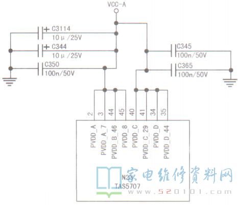 接修一台海信LED50K310X3D型液晶电视,上电后蓝灯亮,二次开机无反应。测量电源板(RSAG7.820.4489/ROH图纸)与主板相连插座XP805中的+5V电压正常,STB端电压为3.9V ,说明主板已经发出开机信号。XP805 中12V输出电压在开机时升到2V后便快速降到0V,判断电源板工作异常。测量PFC电压(测试点为电容C822、C824两端)约为400V,主电源芯片NCP1396①②脚VCC供电约为17V,均正常。在路测量开关电源次级整流二极管,发现16V整流二极管VD841短路。拆卸VD841测量,VD841正常,看来主板上有短路元件。查看线路走向,发现此电压供给伴音功放N23(TAS5707),如图1所示。