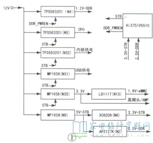 上电后,电源电路输出12V电压,先经N9( MP1658 )DC-DC输出5V_ STB电压,一路经过N6( XC6209 )稳压输出3.3V_ STB电压,另一路经N2( AP2127K)输出2.5V_DDR电压。CPU (型号:HI3751V5510M00)得到3.3V_ STB和2.5V_ DDR供电后,输出的STANDBY(简称STB)信号为高电平,分4路输出,同时控制N35、N31、N32和N5这4个电压变换芯片,分别输出3.3V.USB5V、内核供电、CPU小信号供电。其中,N35输出的3.3V送给LDO芯片N15,稳压后输出1.8V_ eMMC电压,送往eMMC电路。