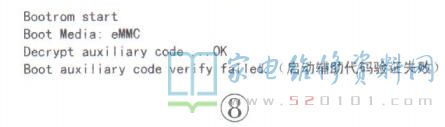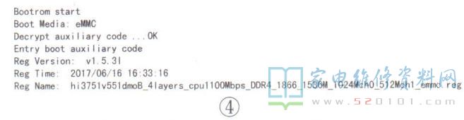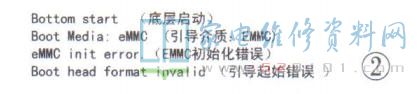 上述打印信息表示CPU已经工作,eMMC没有工作,或者eMMC与CPU之间通讯异常。实修发现此故障原因多为eMMC供电异常或者eMMC损坏,少数为eMMC与CPU之间通讯阻容元件损坏或CPU损坏。