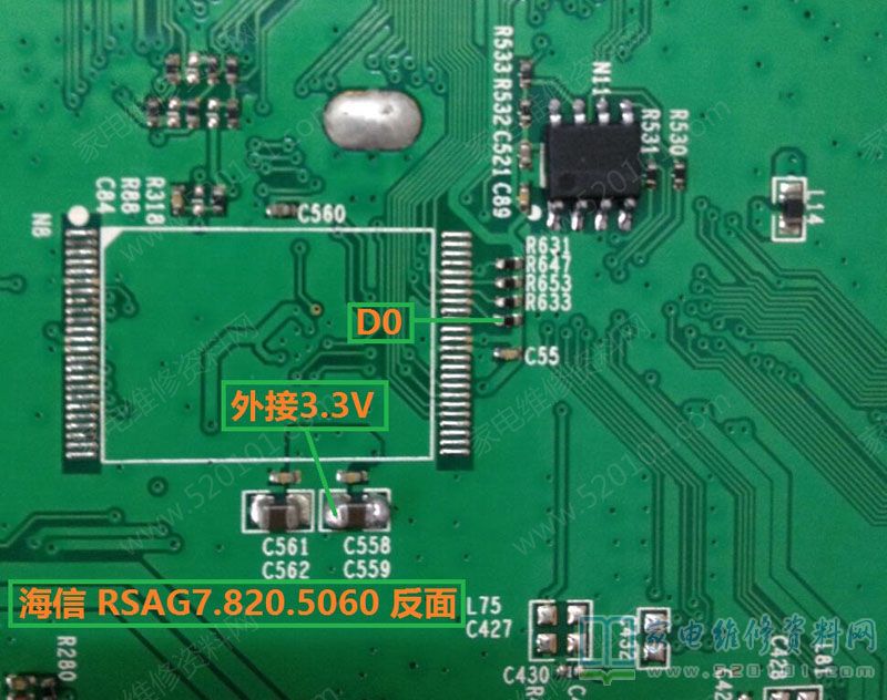 海信RSAG7.820.5060主板EMMC点位图 2022-04-01 18:12:18 阅读 912 次 评论 0 条 摘要: 海信液晶电视采用RSAG7.820.5060/ROH主板的EMMC读写飞线点位如下图所示,主板的正面如图1所示为CMD、CLK点位,主板的反面图2是外接3.3V和D0点位,仅供大家维修参考。 海信液晶电视采用RSAG7.820.5060/ROH主板的EMMC读写飞线点位如下图所示,主板的正面如图1所示为CMD、CLK点位,主板的反面图2是外接3.3V和D0点位,仅供大家维修参考。 版权声明:本文为转载文章,版权归原作者所有,欢迎分享本文,转载请保留出处! 点赞 分享: PREVIOUS:海信液晶RSAG7.820.5277主板EMMC点位图 NEXT:海尔液晶电视T966机芯模块EMMC点位图 文章导航