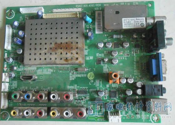 插上触摸键不能开关机,说明CPU没工作,取掉主芯片屏蔽罩,测24C32的8脚才2.6V,正常是3.3V,顺线路由N103而来,N103输入5V正常,输出换了滤波电容还是2.6V,手头没这种中功率的三端稳压,用DC-DC小板代替,开机蓝屏,出现海信LOGO,插上信号,喇叭也有伴音了,故障修复。