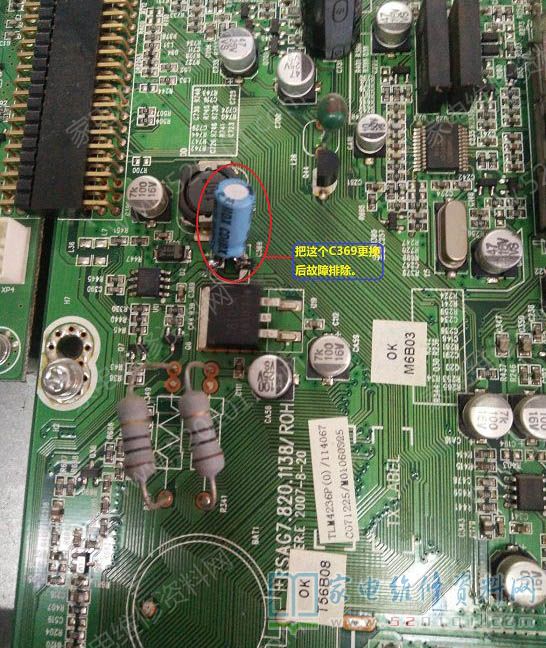 海信TLM4236P液晶电视有图像无声音的故障维修 2022-04-15 18:57:44 阅读 1342 次 评论 0 条 摘要: 接修一台海信TLM4236P液晶电视,故障表现为图像正常无伴音,忽然想起多年前修了一台同样的机型,冷机时无伴音,开机后十分钟后声音才慢慢出来。马上打开电脑查看几年前做的笔记,查到了电视机型号。解决方法:把 接修一台海信TLM4236P液晶电视,故障表现为图像正常无伴音,忽然想起多年前修了一台同样的机型,冷机时无伴音,开机后十分钟后声音才慢慢出来。马上打开电脑查看几年前做的笔记,查到了电视机型号。解决方法:把电视机后盖打开找到U11芯片MP1583DN的2脚对地电容C369(47uF/25V)换掉后再开机故障修复,此案例为通病故障。 版权声明:本文为转载文章,版权归原作者所有,欢迎分享本文,转载请保留出处! 点赞 分享: PREVIOUS:海信LED50EC500U液晶电视无法开机的故障维修 NEXT:康佳LED49R6610U液晶电视开机三无的故障维修 文章导航