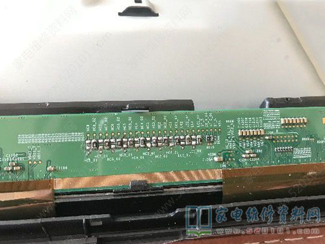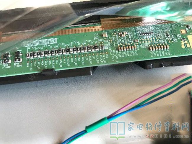 接修一台海信LED50EC520UA液晶电视,故障表现如下图2所示,图像上下抖动,拔掉一边排线,看到故障的情况如图2所示。解决方法是把图5这一排电阻中间的0Ω全部拆了即可。
