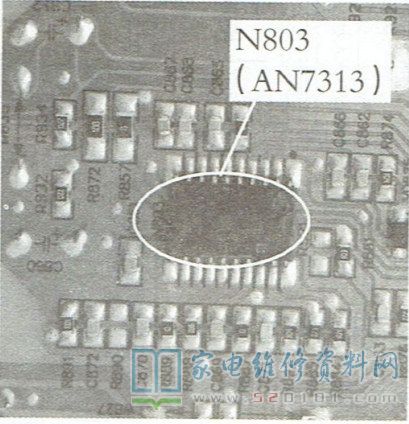 接修一台海信TLM26V68液晶电视,开机后光栅很暗,只能看到暗淡的图像,但伴音正常。拆开机壳,目测电源二合一板(型号为RSAG7.820.1646/ROH图纸)上无明显损坏的元件。通电用万用表直流电压挡测得电源二合一板输出的5V、12V电压均正常,但背光灯亮度很暗。断电后手摸背光集成块N803 (FAN7313) 表面发烫,据此判断集成块N803性能不良。找到一同型号的集成块代换,焊好后恢复各接插件,通电试机,图像正常,故障排除。相关实物如下图所示。