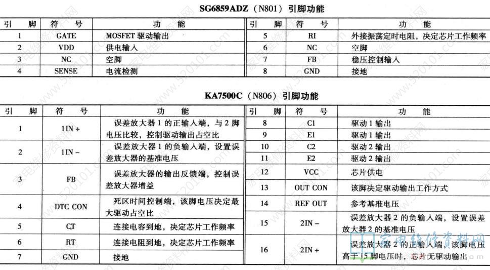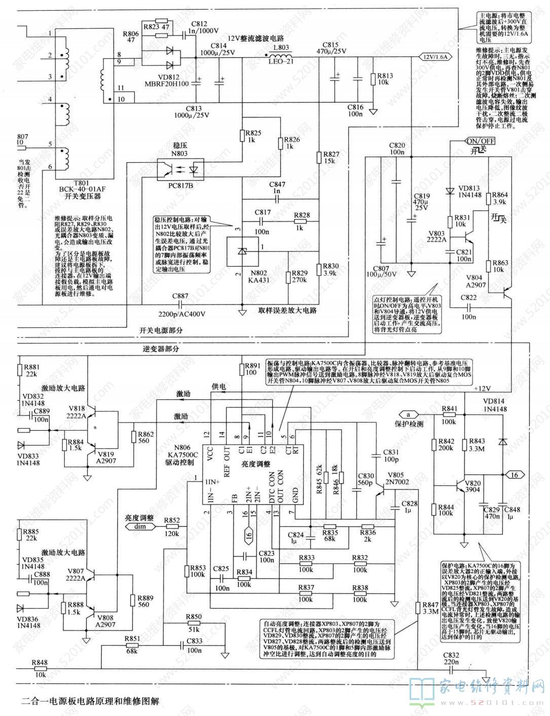 其中开关电源电路采用反激式方式,由驱动控制电路IC801 ( SG6859ADZ)、激励电路V813、V814、大功率MOSFET (开关管) v801、 开关变压器T801和稳压控制电路等组成,产生12V/1. 6A电压,给主板及逆变器电路供电。逆变器电路由驱动控制电路KA7500C(N806)、复合MOSFET(开关管)AO4616(N804、N805)、升压变压器T802等组成,采用互补全桥架构,输出两路750V交流高压,经连接器XP803、XP807 驱动两个CCFL背光灯管。电源板上的开关机控制电路只对逆变器电路的开启进行控制,开机时控制系统的ON/OFF高电平经XP805的4脚送人电源板,使V803、V804 导通,将开关电源部分输出的12V电压送给逆变器电路,背光灯亮度(dim) 调整电压通过连接器XP805的3脚送人电源板;电源电路的12V/1. 6A电压直接送到互补全桥电路N804、N805 的3脚,逆变器电路启动工作,将背光灯点亮。