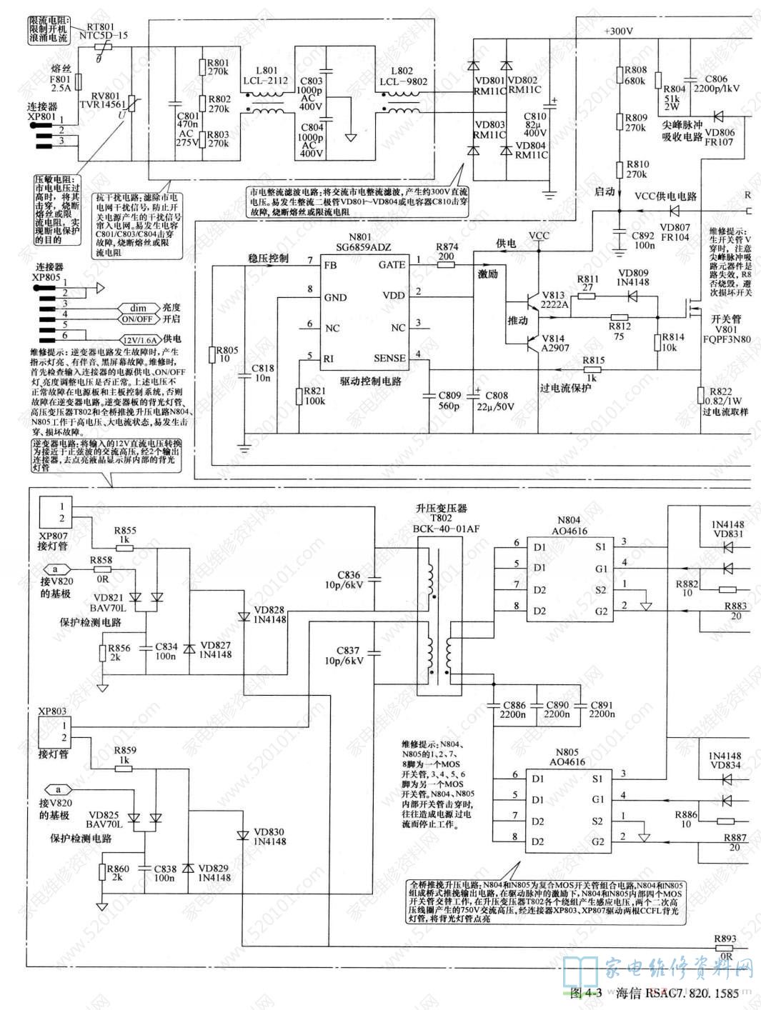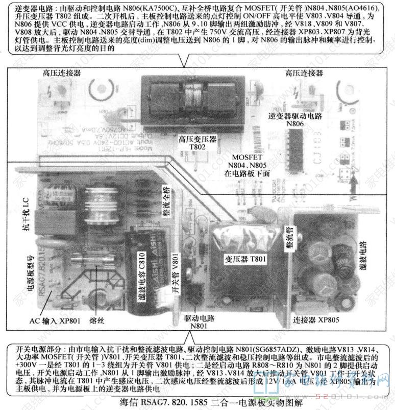 海信RSAG7.820. 1585二合一电源板引起的故障主要有两种:一是指示灯不亮,多为电源部分故障;二是有声无光,则是背光灯逆变器故障。为了区分是电源板故障还是主电路板故障,拔掉与主电路板的连接器XP805,将电源板拆下,在XP806的5、6脚12V/1. 6A输出端接假负载,并用电阻跨接在XP806的5、6脚和4脚之间,为电源板提供ON/OFF点灯启动电压,然后通电对电源板进行维修。