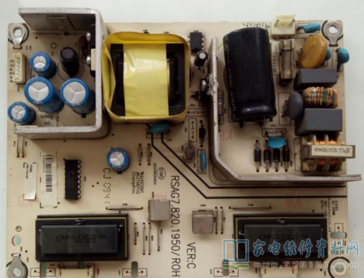 接修一台海信TLM24V68P液晶电视,故障表现为开机显示“海信”厂标后黑屏。拆机,上电测得电源二合一板(型号RSAG7.820.1950/ROH) 输出的12V、5V电压均正常,ENA端电压为4.96V,ADJ端电压为1.7V,这说明主板已发出背光开启信号,判断LED背光电路有问题。网购同型号二合一板装机后故障排除。