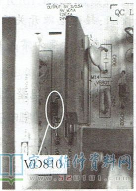 接修一台海信TLM32V89KV型液晶电视,故障现象是三无,拆机检查,电源二合一板(板号为RSAG7.820.1032/ROH)上保险丝F801 (4A/250V)发黑熔断。在路测量主滤波电容C810(330uF/450V)两端电阻,充放电现象正常,整流全桥VB801(D4SB60A)引脚间电阻也正常,但二极管VD810(1N4007) 击穿,如图1所示,其他元件未见异常。换用新VD810后通电试机,测5VS、12V、24V电压均正常,故障排除。