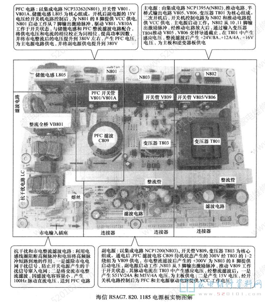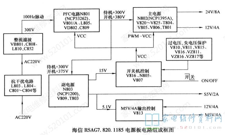 海信液晶彩电采用的RSAG7.820.1185电源板,应用于海信TLM4039CP、TLM40V69P 、TLM42V68P、TLM42V88GP、TLM42P69GP、TLM42E58P等液晶彩电中。海信RSAG7.820.1185电源板实物图解如图1所示;电路组成框图如图2所示。该电源板集成电路采用NCP33262 (N801) + NCP1200 (N803) + NCP1395A (N802) 组合方案。