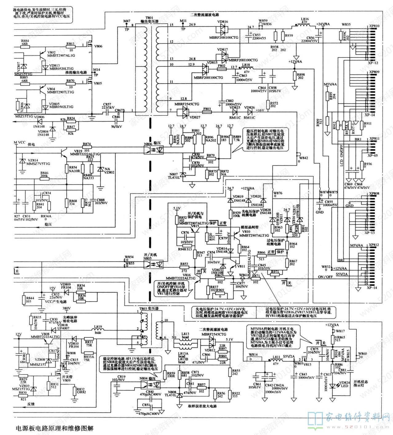 如果测PFC电路输出的电压为300V,则是PFC电路未工作,重点检查PFC电路。首先测量N801的8脚有无VCC供电,如果VCC电压正常,则检测N801的7脚有无PFC驱动脉冲输出。如果无PFC驱动脉冲输出,查N801的外围元器件;如果有PFC驱动脉冲输出,则检查7脚外部的V801。4.自动关机如果测主电源开机的瞬间有24V、12V、16V 电压输出,然后自动关机,测量保护电路V811的基极.电压变为高电平0.7V以上,则是以模拟晶闸管为核心的过电压保护电路启动。可采取解除保护的方法进行维修。全部解除保护:将V811的基极对地短路。逐路解除保护:对于过电压保护电路,逐个断开VZ811、VZ816、 VZ817; 对于失电压保护电路,逐个断开VD819、VD820、 VD828 。