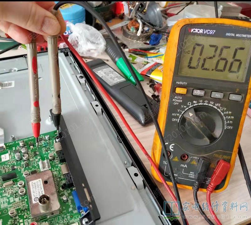 接修一台海信LED32K01液晶电视,故障表现为蓝灯亮不开机。反复开机有时候又能开机,开机之后可以长时间播放没有任何问题。看了一下网上有好几篇关于32k01类似的问题,貌似这款海信蓝灯亮不开机有通病,测了一下电源电压12V和开机3.2V正常,说明主板已经发出正常开机指令。(待机是7V左右)。
