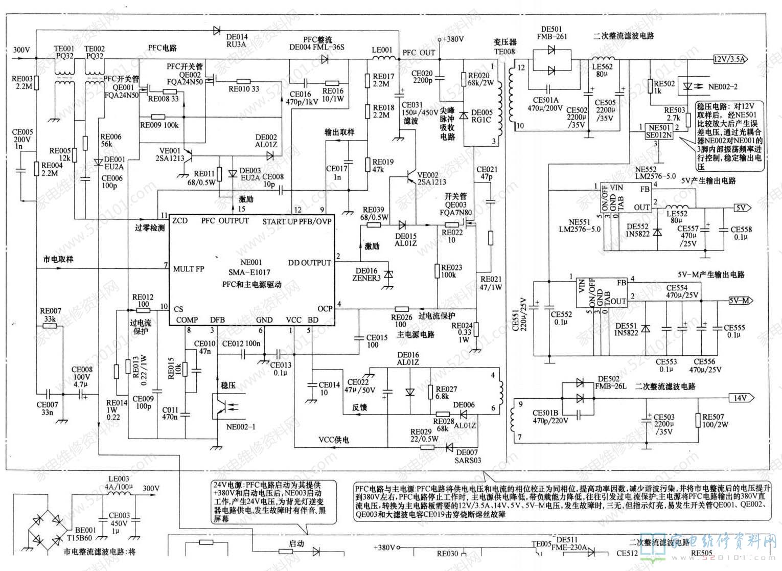 首先测量熔丝FE001是否熔断,如果熔丝熔断,说明电源部分有严重短路故障,首先排除抗干扰电路电容、整流滤波电路全桥和滤波电容、主副开关电源开关管、PFC电路开关管短路击穿故障。