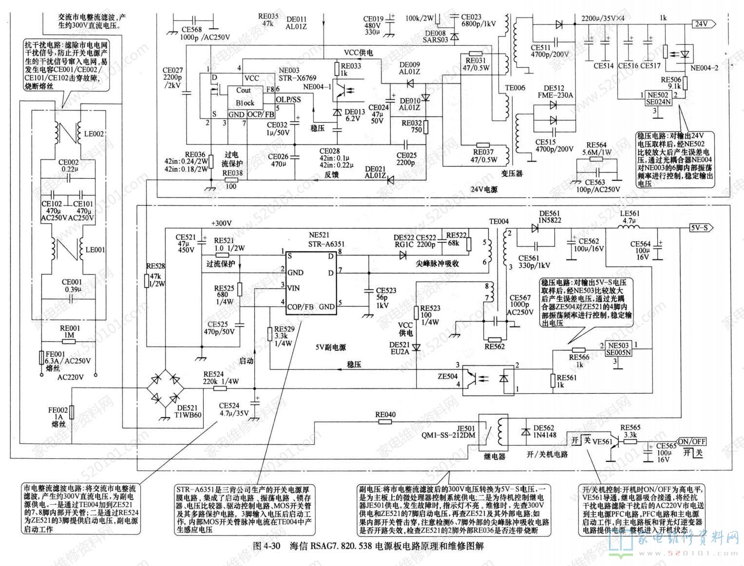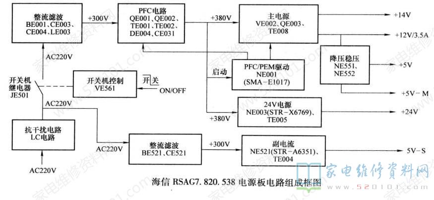 海信RSAG7.820.538电源板实物图解如图1所示;电路组成框图如图2所示。该电源板集成电路采用SMA-E1017 (NE001) + STR-X6769 (NE003) + STR-A6351 (NES21)组合方案。该电源板由四部分组成:一是以驱动控制电路SMA-E1017(NE001)的1/2和VE001、QE001、QE002为核心组成的PFC电路;二是以驱动控制电路SMA-E1017 (NEO01) 的1/2和VE002、QE003 为核心组成的主电源:三是以厚膜电路STR-X6769 (NE003)为核心组成的24V电源;四是以厚膜电路STR-A6351 (NE521) 为核心组成的5V待机副电源。
