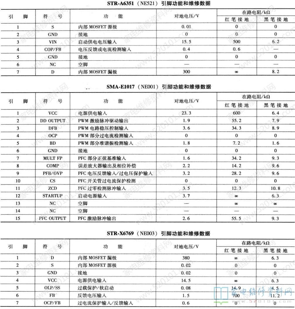 指示灯亮,但不能开机,或开机后自动关机,故障主要在主电源和PFC电路。首先测量开关机电路继电器是否吸合,没有吸合,检查开关机控制电路,否则检查主电源电路。先测量电容CEO31正极输出的PFC-OUT电压,该电压正常时为380V左右如果仅为300V左右,则是PFC电路未工作。先检查NE001 ( SMA-E1017)的12脚是否有300V的启动电压,1脚是否有17V的工作电压。如果1脚电压正常,测量15脚有无激励脉冲输出,无激励脉冲输出,故障在SMA-E1017,否则故障在激励电路VE001和MOSFET (开关管) QEOO1、 QEOO2、 DEOO4 或CEO31。如果PFC-OUT输出电压正常,重点检查主£关电源,一是测量SMA-E1017的2脚有无激励脉冲输出,无动脉神输出,敌障在SMA-E1017, 否则故障在MOSFET (开关管) QEO03; 二是检查二次次整流滤波电路是否发生短路漏电故障,造成主电源过电流保护停止工作。若屡损开关管QE003,应对其漏极外接的DE005、RE020、CE020尖峰脉冲吸收电路和源极电阻E024进行检查;还应对可能造成QE003过电压击穿的稳压控制电路NESO1、NO02进行检测。