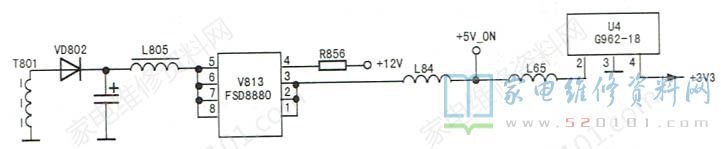 测量U4的②脚输入电压为0.4V,正常电压应为5V。顺着线路查找,+5V_ON电压由电源板(型号:RSAG7.820,2059/ROH)上V813( FSD8880)切换控制而来。测量12V电压正常,v813的④脚控制电压为12V,⑤~⑧脚输入5V也正常,但①~③脚输出电压约为0.4V,判断V813损坏。由于手头无该元件,于是将V813的⑤~⑧脚与①~③脚短接后试机,故障排除。