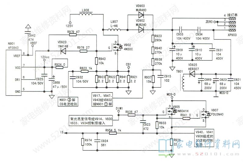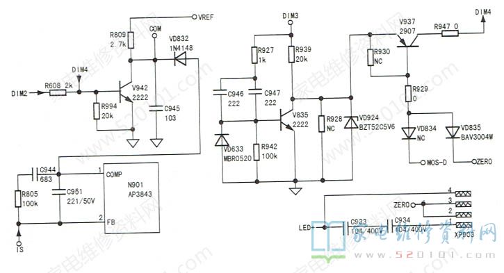 电源正常工作时,②脚反馈(FB )信号通过内部误差放大电路,输出变化的电压,经①脚外接RC网络后送入IC,控制⑥脚驱动脉冲,以保证灯电 流恒定。同时,①脚又通过VD832接V942的集电极。当背光正常时,DIM2信号为低电平,V942截止,AP3843正常工作;若灯串开路,ZERO(XP903②、③脚)信号电压下降(低于6V),V937导通,DIM4信号变为高电压,V942饱和导通,从而拉低AP3843①脚电压,背光控制电路停止工作。断开VD832试机,通电瞬间测得XP903④脚电压超过125V,由此判定故障在灯串上。于是进行检查,发现第四根灯条上的第二颗灯珠开路。替换此灯珠后通电,背灯故障排除。