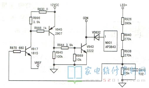 当LED+电压过高时,V917、V945、V943相继饱和导通,N901①脚电压被拉低,迫使N901停止驱动输出。拆下V943试机,背光灯亮,由此推断故障在灯供电OVP检测电路中。检查R926、R940等取样电路正常,测试V943、V945,发现V945的c-e极间已击穿,换新V945后通电,故障排除。