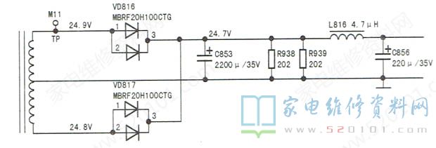 提示:VD816与VD817 组成全波整流电路,如图1所示。VD816的③脚脱焊后变成了半波整流,电压下降,出现光栅闪烁现象。在稳压反馈电路的作用下,其他组输出电压上升,电路过压保护,所以无伴音。