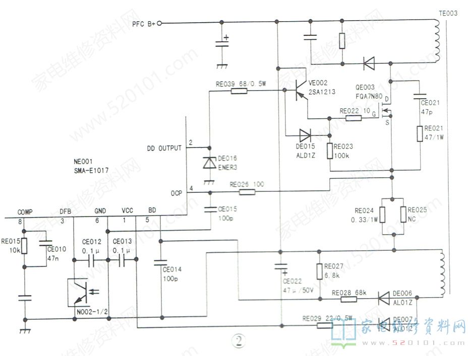 怀疑NE003损坏,用万用表电阻挡在路测量NE003的④⑦脚对②、③脚的阻值,已明显短路,确认NE003已损坏。更换上述损坏元件后试机, 出现蓝屏,显示“无信号”,接上信号后还是显示“无信号”,也无声音。检查电源板,发现无+5V、+14V电压输出,且电源板发出不明显的间断“吱”声。检查以NE001( SMA-E1017)为核心的开关电源与功率因数校正电路,如图2所示,发现NE001的12脚(启动电源输入端)电压正常,但①脚( VCC)电压在10V~15V之间波动。断电,检查+5V、+14V负载没有短路现象,检查NE001外围元件,发现开关管QE003源极电流检测电阻RE024已开路(如图3所示)。将RE024换新后试机,故障排除。