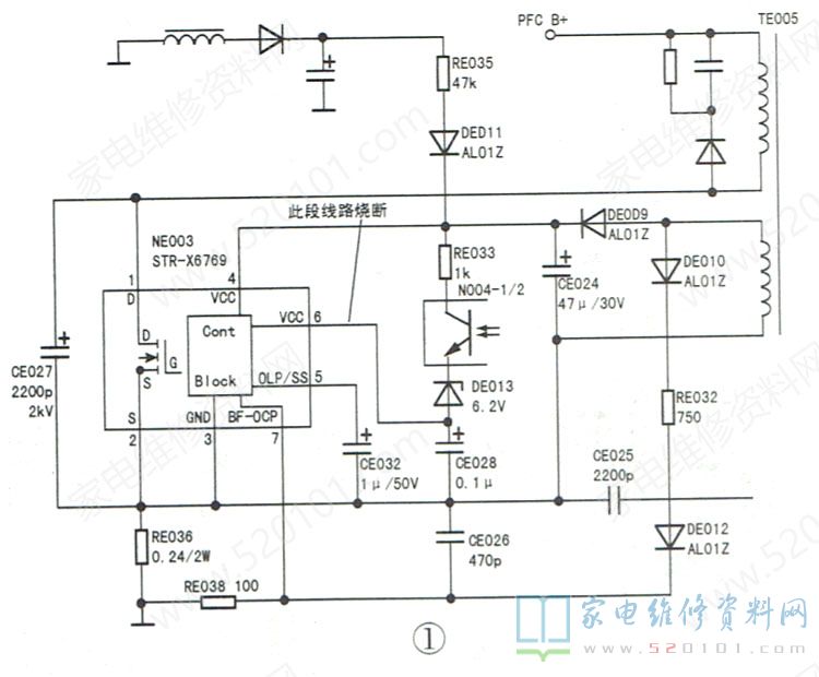 接修一台海信TLM4729P型液晶彩电,使用中突然黑屏、无声音,但指示灯亮。上电试机,指示红灯亮,二次开机后红色指示灯熄灭蓝色指示灯亮,背光不亮,黑屏、无声音,初步判断主板正常,故障在电源板的可能性大。该机电源板型号为RSAG7.820.568A/ROH,由待机电源(+5V-S)、小信号电源(+5V及+14V)、+24V及+12V主电源三部分组成。直观检查,发现+24V及+12V主电源中的CE027、RE036、RE038已烧坏,DE013正端至NE003( STR-X6769 )的⑥脚之间的铜箔已烧断。相关电路如图1所示。