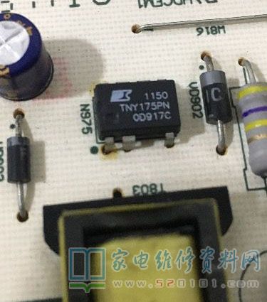 接修一台海信LED42K11P液晶电视,故障表现为开机大概10分钟左右自动关机,1分钟左右然后自动开机,怀疑过热或者元器件不良。开棺检查自动断电后所有电压都没有320V正常,估计问题在5VSB,管理芯片TNY175PN,小心手摸发烫,加一个散热片,放点酒精不再断电,刚好手里有款另一型号电源板,代换后一切正常。