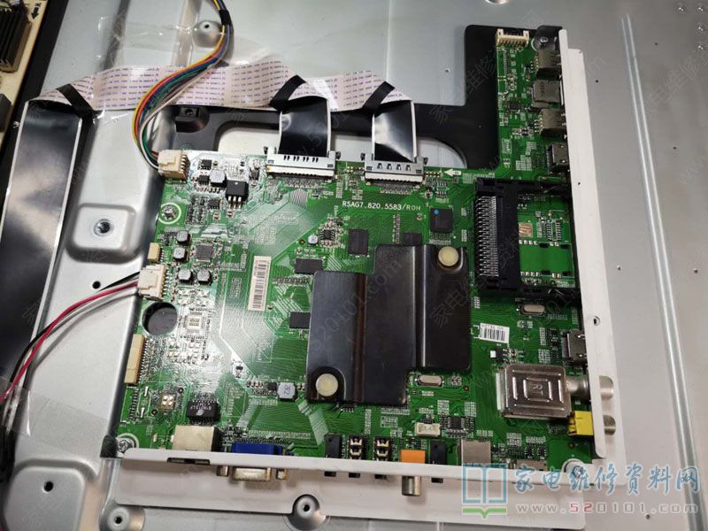 不过好景不长,整上后盖才发现,图像在暗背景下会有一道道的竖条,亮背景下还直看不出来,开盖测各处电压均无可疑之处,用手按压主板到逻辑板的排线,发现竖条在变化,不由大喜。随后找来一块薄薄的塑料片剪得大小正合适,压到排线插头处,插上插头,故障排除。