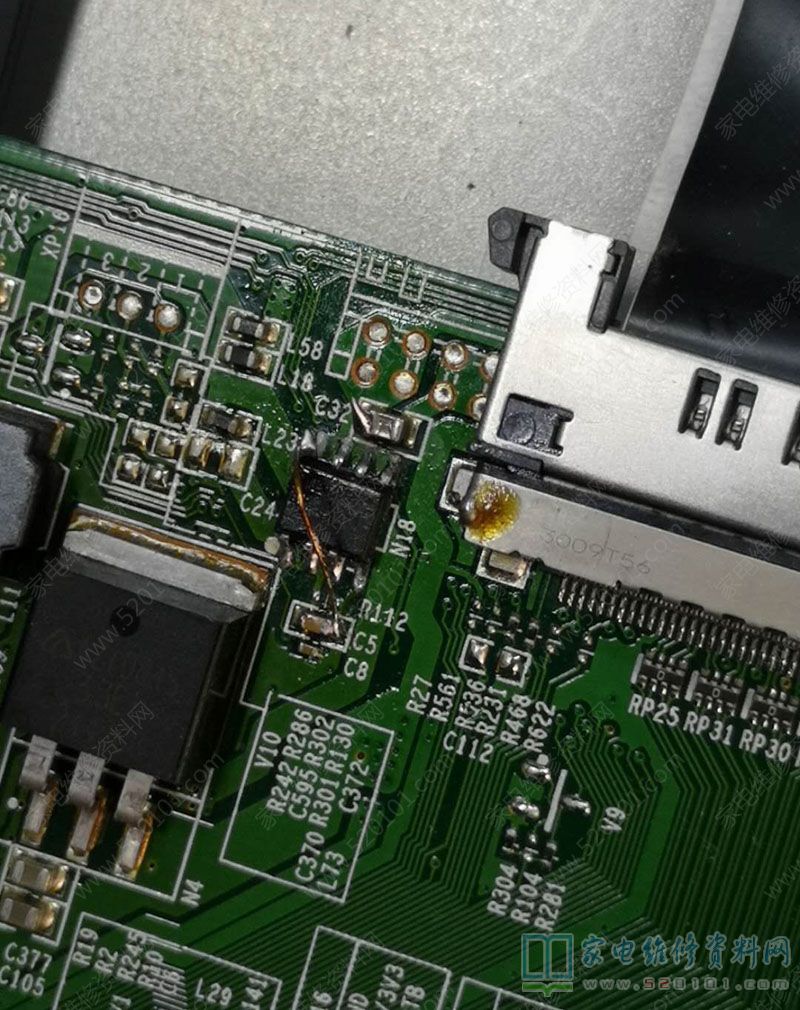 接修一条海信液晶电视,故障表现为通电后有伴音,光栅,无图像, 开盖,检修,查逻辑板,查VGA 0V、 GHL 0V 保险两端电压0V,测保险完好无损。给保险外接12V电源,竟然图像出来了,心中不由窃喜。顺腾摸瓜查到主板,发现12V电源是从Q4459出来的,查4459的相关资料。原来竟然是一直P沟道的场管,30V/6.5A,1、2、3脚为D极,4脚为G极,5678为S极。查4脚为4.2V,123脚为12V,而5678却没有12V。看样真凶就是它了。将其取下。手头没有此件,某宝上虽有,价格也很便宜,但时间耽搁不起,跟人客户说好明天取机的。