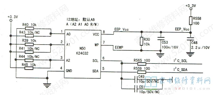 虽然此时机器仍不能二次开机,但可以看到部分打印信息,说明CPU已经工作。关机后,短接存储器K24C32的⑤、⑥脚开机,约30s后断开⑤、⑥脚的短接线,电视二次开机,故障排除。相关电路见图1。