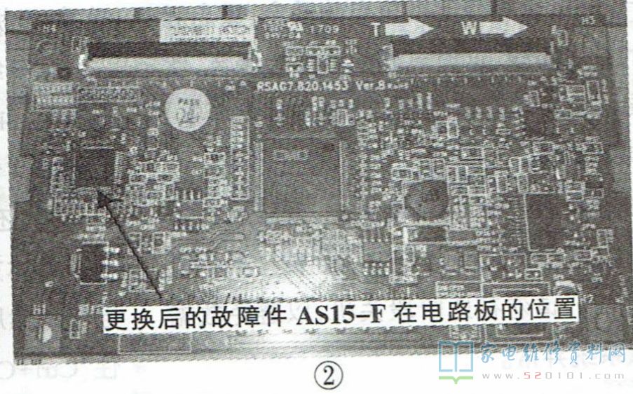 在以往的维修中,AS15-G损坏率非常高,故障表现为黑屏、白屏、花屏、负像、鬼脸等。用热风枪取下U6,因手头没有AS15-G,换上AS15-F,如图2所示。上电试机,图像正常,故障排除。