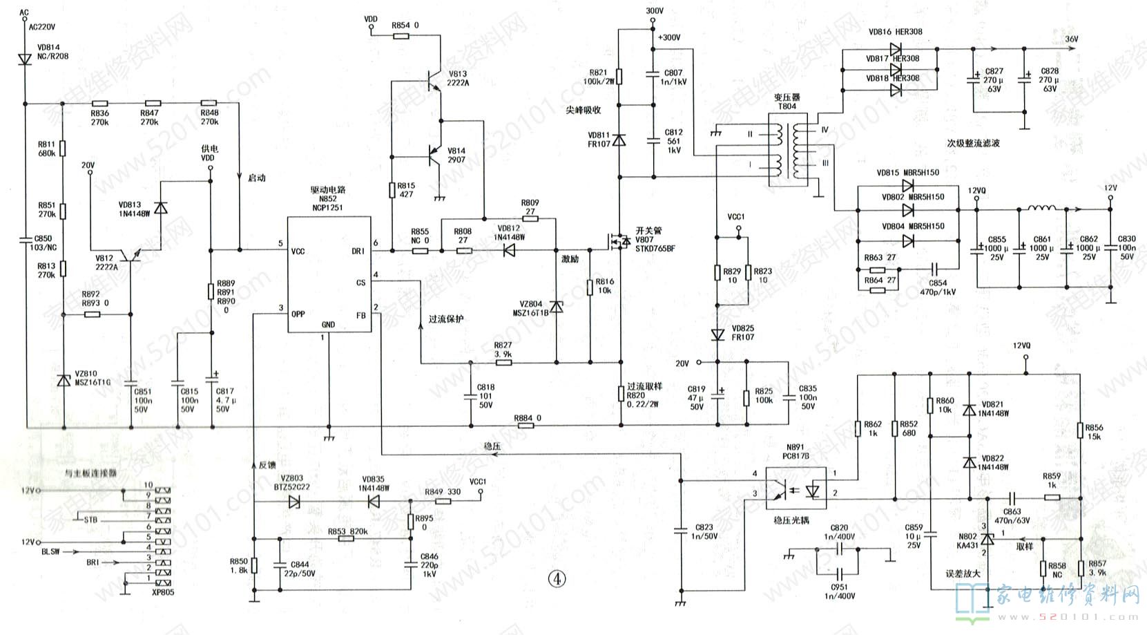 开机后,市电整流滤波后产生的+300V电压经T804的初级绕组I为V807的D极供电,如图4所示。