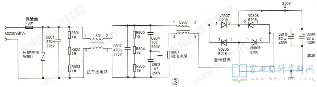 AC220V市电经电源开关控制后,首先进入抗干扰和市电整流滤波电路,如图3所示。该电路由电压过高限制电路、防浪涌冲击电路、进线抗干扰电路、市电整流滤波电路组成,产生+300V直流电压,为开关电源电路供电。