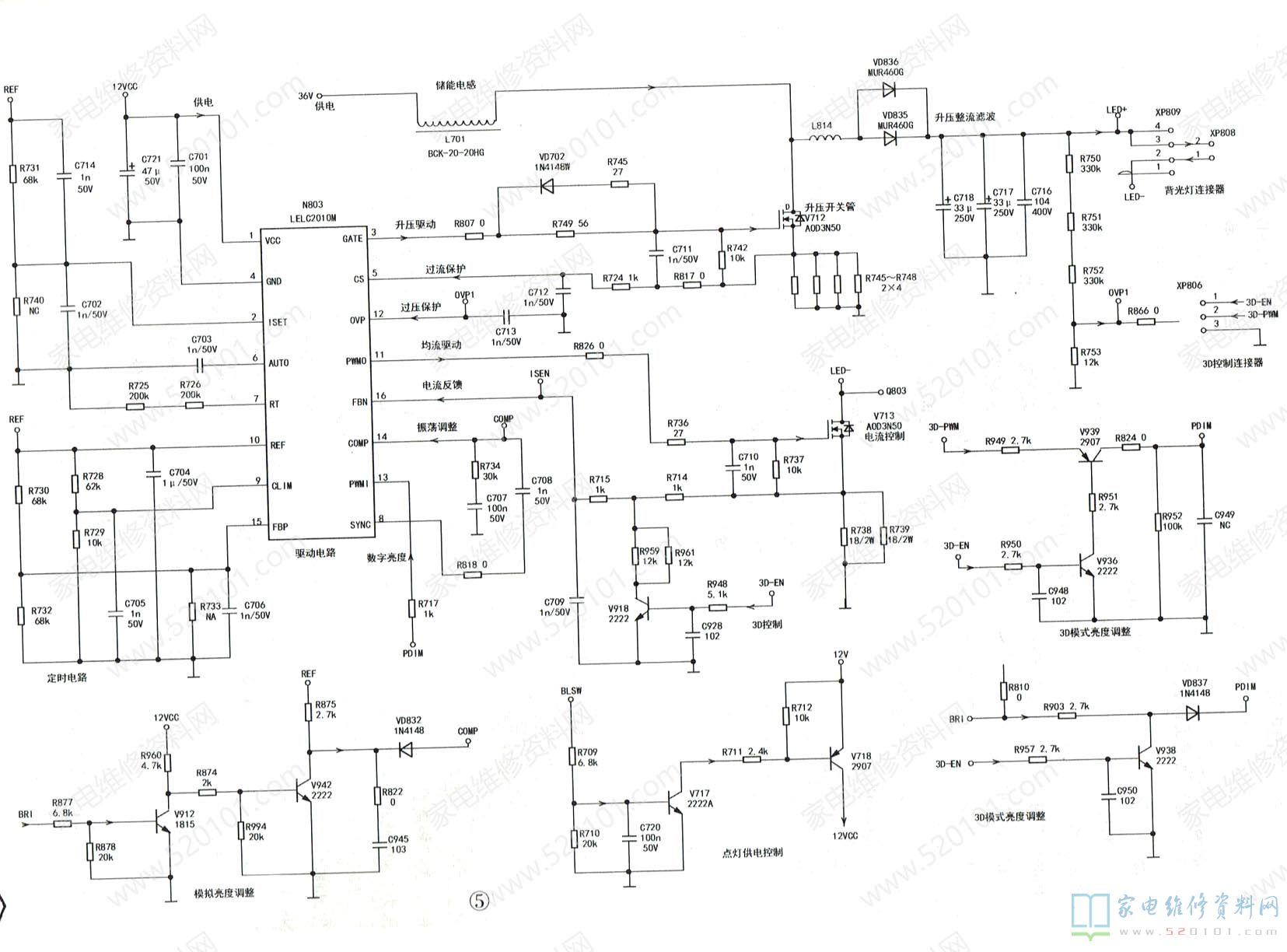 该板的背光电路由SELC2010M(N803 )、V712、L701、VD835/836、C717/718.V713等元件组成,如图5所示。将开关电源输出的36V电压提升,为LED背光灯串供电,并对LED背光灯串电流进行控制和调整。