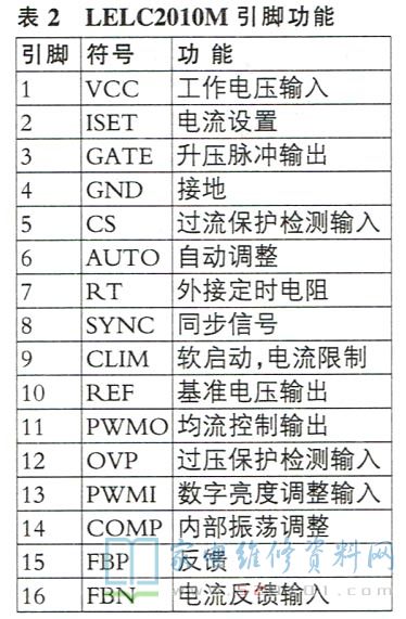 SELC2010M是LED背光灯驱动控制电路,内含偏置电路、参考电压、检测逻辑控制电路、振荡器、驱动输出电路、电流检测电路等,其引脚功能见表2。