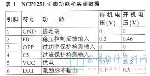 过功率保护功能主要由N852的③脚及外部元器件组成。正常工作时,当某种原因造成vCC升高时,N852的③脚电压也跟着变高,在IC内部电路的控制下v807的导通时间减少,输出功率下降。当vCC1过高时,N852内部工作电路复位,重新启动。若OPP状态没有改变,则电路一直工作在“启动一+保护一启动"状态,直到OPP状态解除为止。
