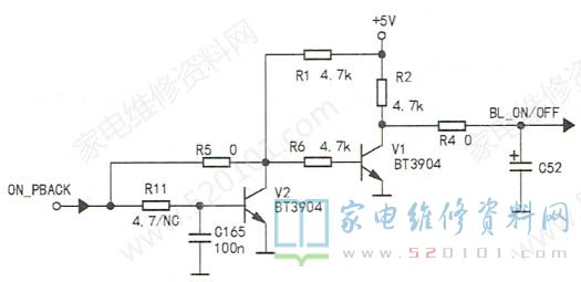 读罢《拆除一只三极管,修复一块液晶彩电主板-海信LED46K16X3D液晶电视黑屏的故障维修》一文颇有感触。该机的背光控制原理是:二次开机后,主芯片的ON_PBACK端输出低电平- >三极管V1截止->C极(即BL ON/OFF端)输出高电平->背光灯点亮,如图1所示。