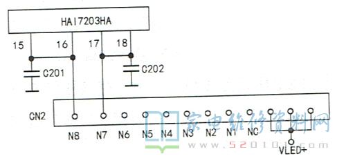接修一台海信LED39K300J型液晶彩电,开机后显示蓝屏及厂标"Hisense"后黑屏。根据经验,判断LED灯条或恒流板不良。反复开/关机,发现屏幕右侧距上边缘约8cm处有一横向暗区,由此判断灯条有问题,需拆开屏更换灯珠。上电测量恒流板(奇美L390H1-1EE )插座CN2中VLED+电压,开机时为23V,背光亮时升至约40V。测量N1~N8端的反馈电压(接LED灯条的负极,板上预留有8个测试点),N1~N6、N8电压变化情况基本一致:开机时为1V左右,灯亮时电压变至1.1V(各点电压略有不同),但N7端电压在开机时为0.9V,灯亮后降为0V,可见这一组灯珠异常 。为确诊,外接自制可调节直流电源,输出电压调到40V,正极接灯条扁平排线VLED+,负极依次接各灯串负端,并接上电压表。接N1~N6、N8端时, 40V电压均会大幅下降,而接N7端时电压略微降低,由此确认N7所连灯条异常。因用户急用,决定改动电路进行应急维修。背光板上有两块同型号(HAI7203HA)LED驱动IC,N8端接HAI7203HA的15、16脚,N7端接同一驱动IC的17、18脚,如图1所示。