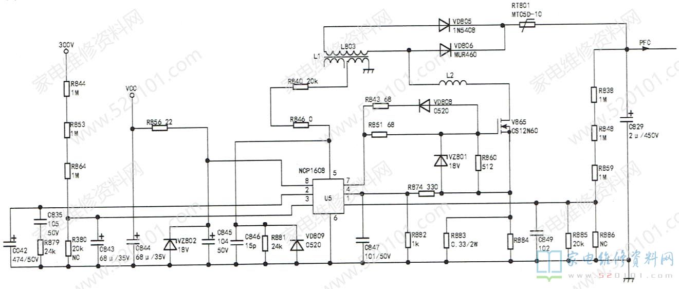本机采用4849型电源板,PFC芯片为NCP1608,如图1所示。本着先易后难原则,先更换滤波电容C829 (82uF/450V), 故障不变。观察NCP1608外围电路大部分都是贴片元件,根据经验,贴片元件下面的粘胶易漏电。拆下 R844、R853、R864、R838、R848、R859等几个大功率贴片电阻,用酒精把电阻和电路板上的胶清洗干净,检测各电阻阻值正常,恢复电路,开机测PFC电压为稳定的375V,且故障不再出现。