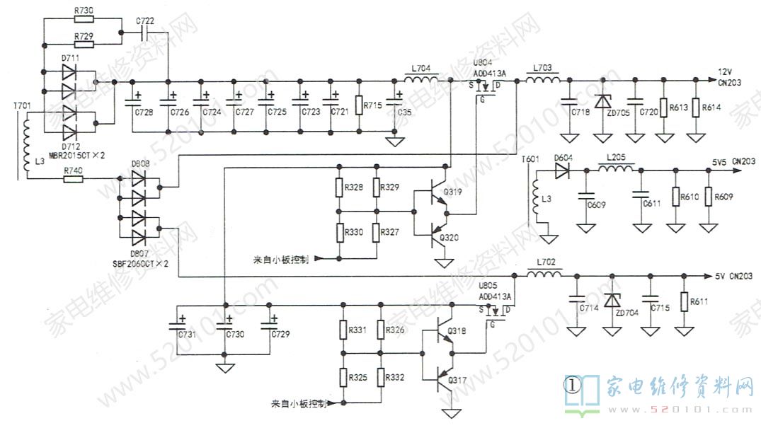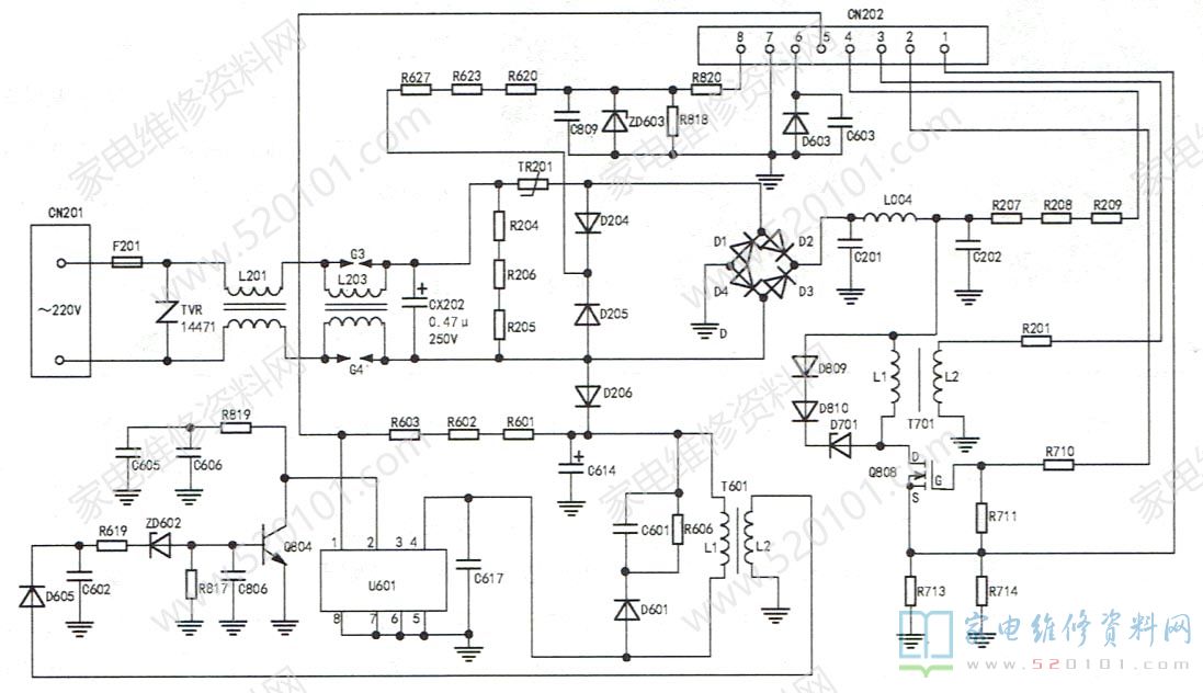 AC 220V电压经高频滤波后分为三路:第一路经D1~D4桥式整流、C201、L004和C202组成的丌型滤波,输出300V直流电供主电源;第二路经D204、D205和D1、D4桥式整流,R627、R623、R620及C809、ZD603、R820滤波稳压,通过插座CN202的⑧脚给小板供电;第三路经D206和D1半波整流、C614滤波,为副电源供电。主电源由开关变压器T701和场效应管Q808等元件组成,副电源由U601(TNY276PN)、T601等元件组成。