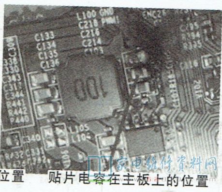 另有一台同型号机器,故障现象也是三无。拆机检查,电源板正常,转向检查主板(型号为RSAG7.820.5551/ROH)。目测主板,发现N100输出端外接的两只贴片电容有烧焦痕迹,如图1所示。用万用表测量这两只电容,一只开路,一只击穿。拆下这两只贴片电容,用刀片刮净此处线路,用导线连接烧断的铜箔,根据经验,这两只贴片电容应是滤波电容,应急维修时,可不安装,或换用47uF/25V电解电容。按上述方法处理后试机,故障排除。