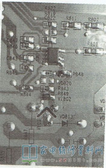 接修一台海信LED32K11型液晶电视,指示灯不亮、不开机。该机电源二合一板板号为RSAG7.820.2317/ROH。测保险F801 (4A/250V )正常,开关管V801(BP50814)击穿,电阻R847 (3.3Ω/2W )、R844(5.1kΩ)、R848(680Ω)开路,如图1所示。将上述所损坏元件换新,并且更换电源集成块N801 (贴片NCP1271A) 后装机上电,故障排除。