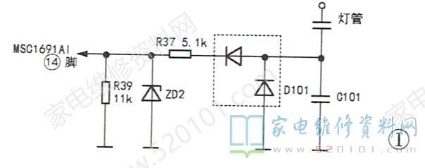 本机背光由主板和副板两块板组成,电路结构复杂,两块板上各有一块驱动芯片OZ9981。根据经验,此故障多是保护电路动作所致。本机保护电路由多块电压比较器组成,在没有电路图的情况下要搞清楚来龙去脉并非易事,决定先找到控制芯片的下述3个功能脚:一是灯管电压反馈脚VS,二是灯管电流反馈脚IS,三是芯片延时保护脚。前两个引脚有一个正常工作的电压范围,若超出这个范围,芯片会进入保护状态。第3个脚外接一只电容,正常工作时电压是0V,当芯片检测到异常时,该脚输出电流向外接电容充电,约1s后,电容上电压达到动作阈值,芯片进入保护状态。常说的“去保护”就是把该脚通过一只1k~10k电阻或直接接地,使该脚电压达不到动作阈值。当然,取消保护是有风险的,作为一种维修手段可以,作为解决问题的方法就不安全了。查资料得知MSC1691AI的13脚是IS检测端,14脚是VS检测端,这两个脚的保护动作阈值都是2V。开机时,监测13脚电压仅1V,而14脚电压超过2V,这说明本机为过压保护故障。该机VS检修电路如图1所示。
