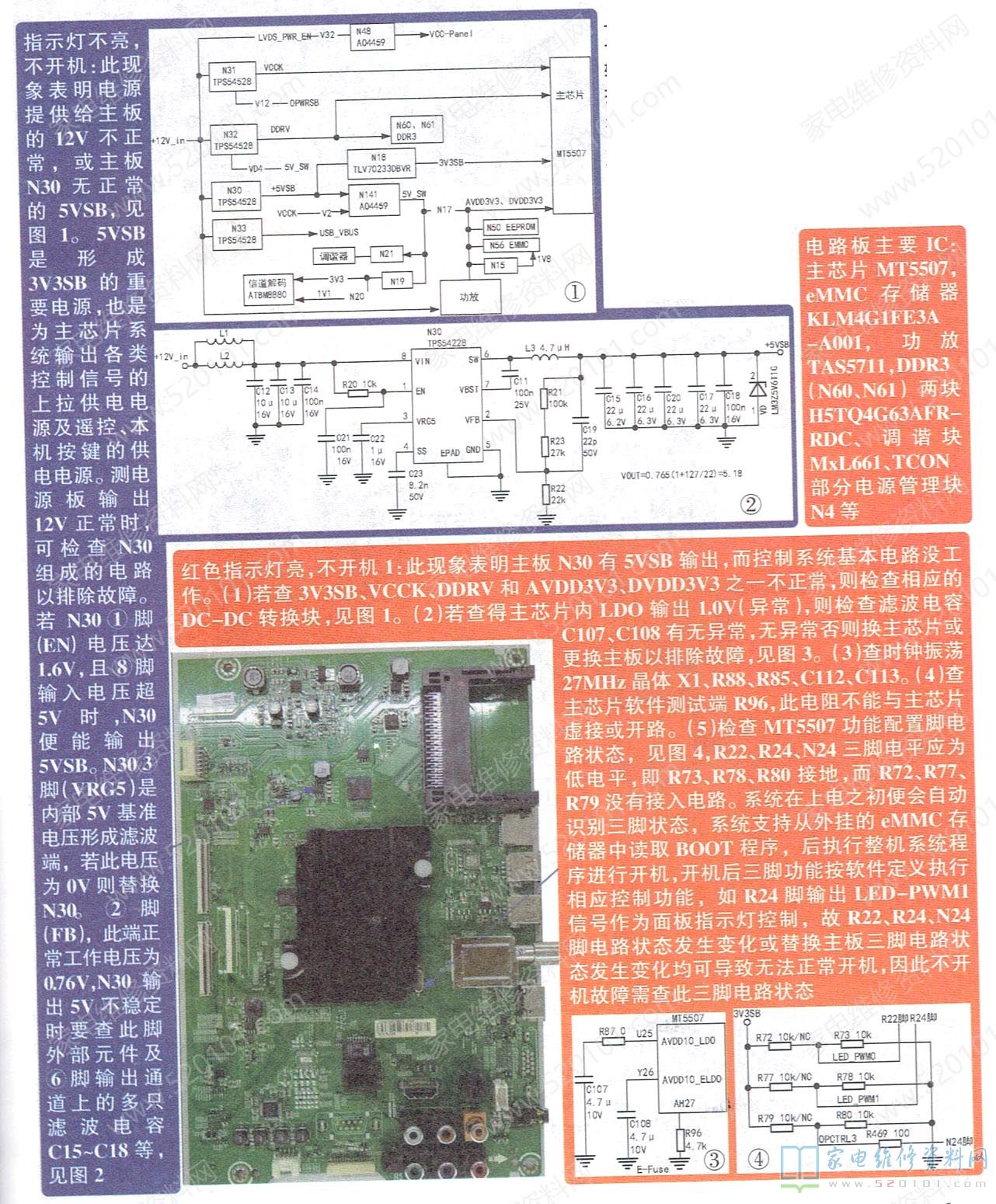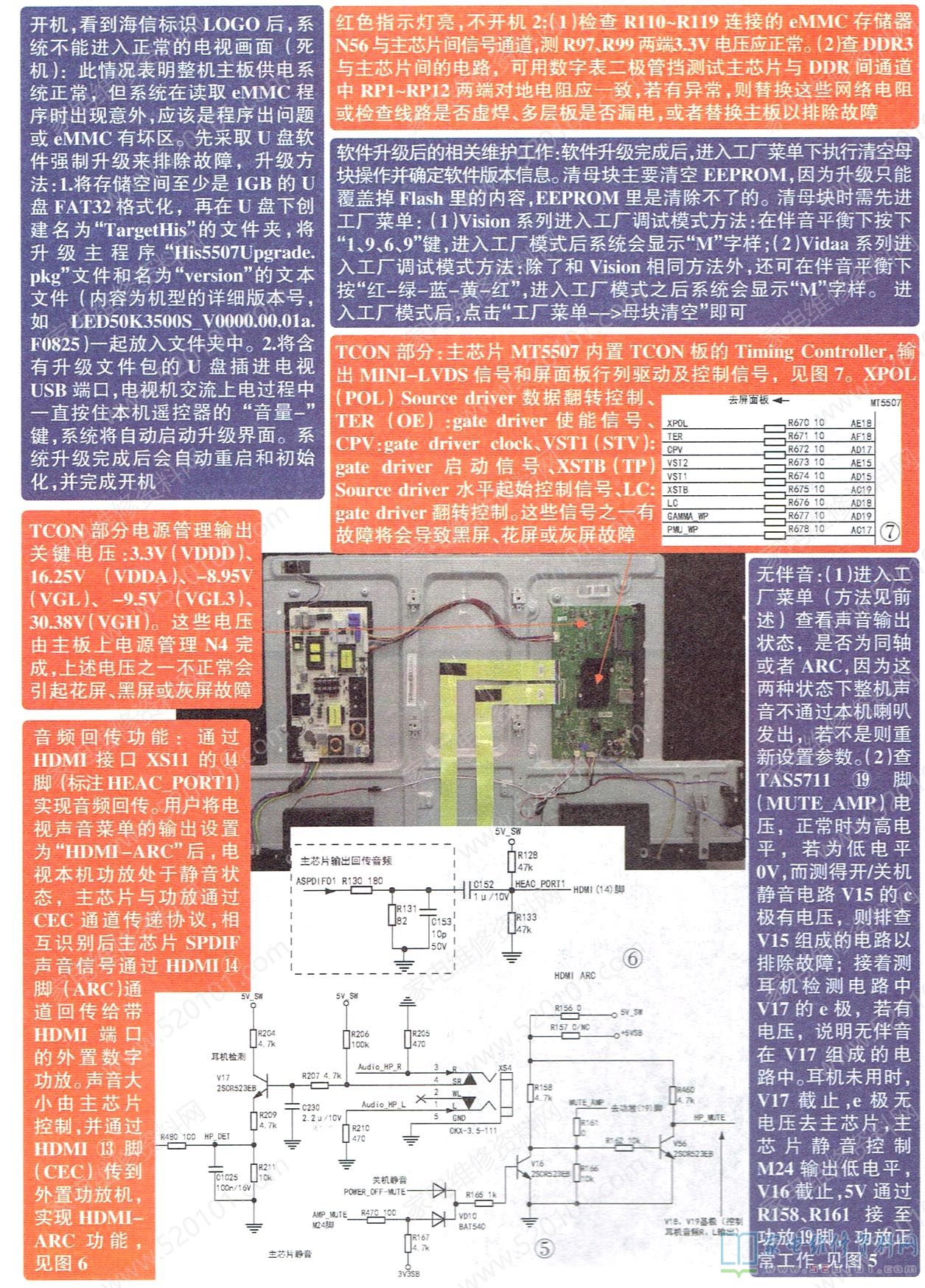 海信RSAG2.908.6510主板组件被应用在海信的LED50K3500S、LED55K3500S等型号彩电中。该主板所用主芯片为MT5507,与其他采用MT5507方案主板的不同在于,开发了主芯片内TCON控制电路,能输出mini-LVDS信号和屏工作的各类控制信号,且还设计有屏工作所需的一些关键电压等。该型号主板组件因产品使用屏的不同,主板电路中TCON部分设计有所区别,并且上屏信号也有所不同,故编号RSAG2.908.6510-04 (50英寸)与RSAG2.908.6510- 05(55英寸)是不能互换的,虽然两个主板组件均属6510主板。