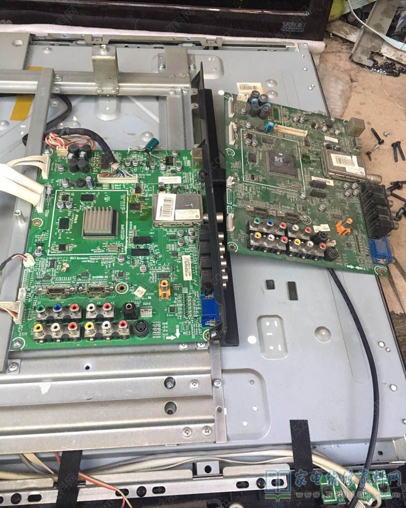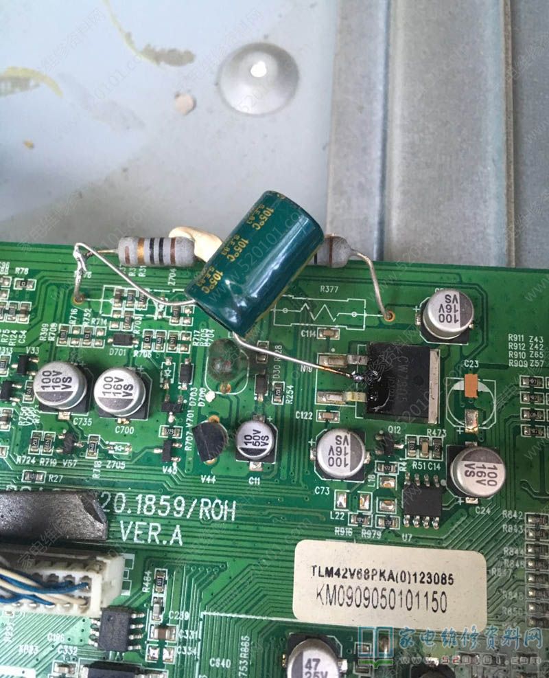 接修一台海信TLM42V68PKA液晶电视,故障表现为声音断断续续时有时无,拆机后摸功放烫手,找料板换,故障不变,写数据,故障不变,查功放资料TFA9810T,其7脚为静音控制,电压时有时无,声音也时有时无,查静音电路,几个电阻,一个三极管完全正常,不知道怎么玩了,用示波器查看总线时钟都没结果,靠在功放供电上,有很多杂波,测电源板上的电源又没有杂波,干扰,并个电容搞定,故障修复,具体如下图所示。