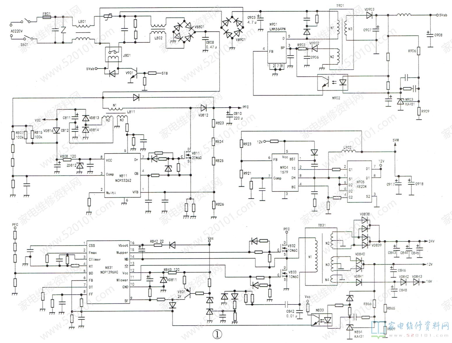 主电源驱动IC型号为NCP1396AG(N831),其引脚功能①脚,软启动控制;②脚,最高频率设定;③脚,振荡定时电容;④脚,振荡定时电阻;⑤脚,PFC欠压保护检测信号输入;⑥脚,稳压反馈信号输入;⑦脚,死区时间设定;⑧脚,快速保护检测信号输入;⑨脚,延迟保护检测信号输入10脚,地;11脚,下边功率管激励输出;12脚,供电;13脚,空;14脚,上管地;15脚,上功率管激励输出;16脚,上管激励电路自举供电。
