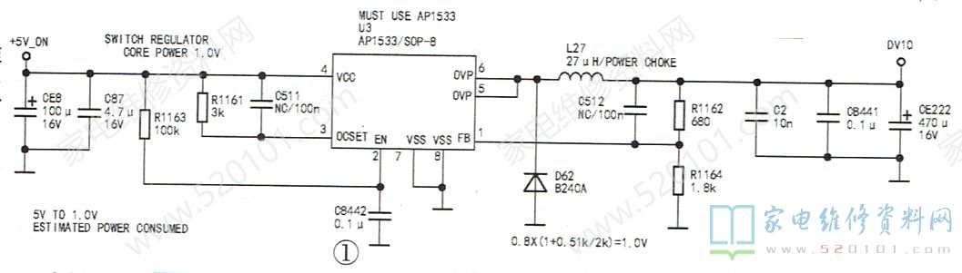5V电压从U3 ( AP1533)的④脚输入,经内部开/关控制后从⑤、⑥脚输出脉冲,通过L27储能、C2滤波后输出稳定的I1.0V直流电压。U3的①脚为输出电压取样反馈调节端。D62 为续流二极管,在开关管关断期间泄放127中的能量,从而继续向负载供电。通电后手摸U3很烫,断电测C2两端在路电阻约22Ω。因是1V低压电路,22Ω阻值应属正常,但U3工作在开关状态,发烫就不正常。经查续流管D62正极虚焊。补焊D62后开机,U3输出电压 稳定为1.09V,且U3.U34的发热量明显下降,长时间试机,故障不再出现。总结:续流管虚焊引起电源块AP1533工作状态发生改变,仅开关管导通时才向负载输出电流,即DC-DC电路工作在脉冲滤波状态。滤波不良的电压加到主芯片内核电路上,使CPU工作出错,从而出现死机、花屏故障,同时DC-DC块与主芯片发热量增大。编者注:内核工作需要的电压误差电压是非常小的,故系统工作不稳定时监测内核供电的稳定是故障检修排除的重点之一。
