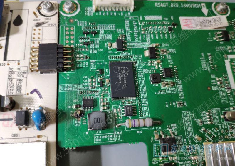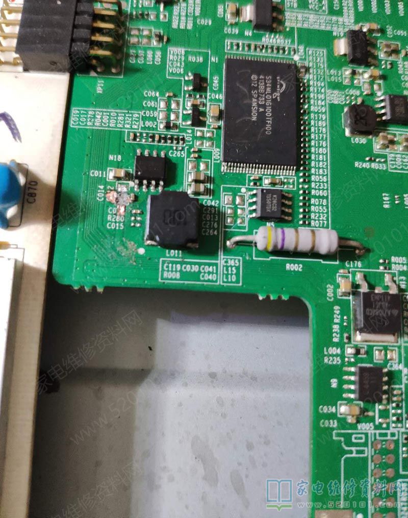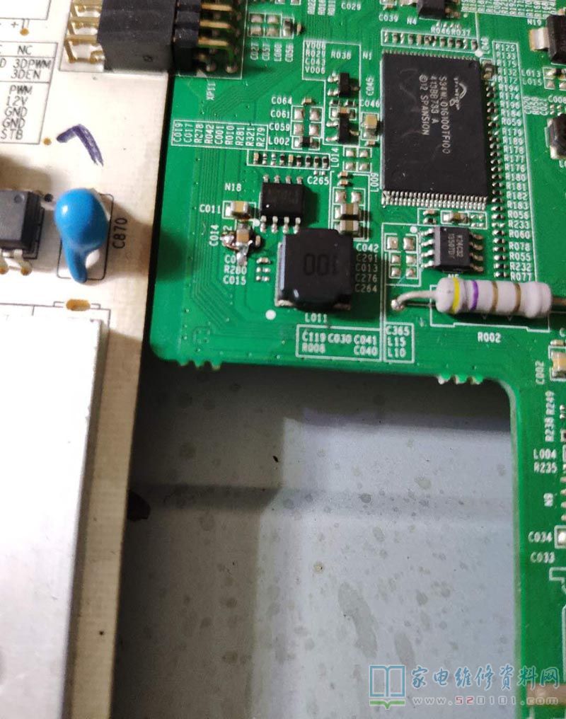 接修一台海信LED32K20JW液晶电视,故障表现为开机指示灯不亮,整机呈现三无的状态,此通病我也遇到了,如下图所示,清理后由于不知道该如何接线路,后来分析清理图片左面要接在下面电路板,最后用细线接在稳压芯片稳压芯片N18的2脚,而不是有人说的1脚,我是参考图纸结合线路图接好的,修好了也没有别人说的开机有吱吱声,完全正常。