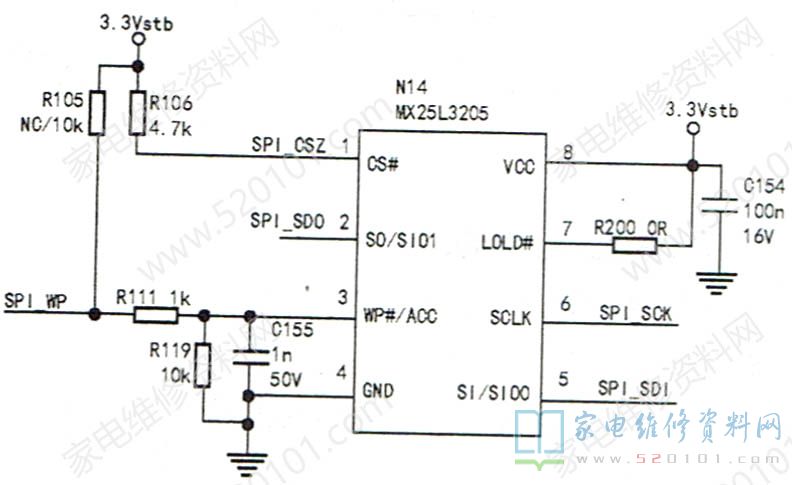 接修一台海信TLM32H78液晶电视,故障现象是出现横线千扰后花屏死机。故障原因:本机采用RSAG7.820.4293主板,常见原因是FLASH芯片N14(MX25L3205)性能不良,如图1所示。