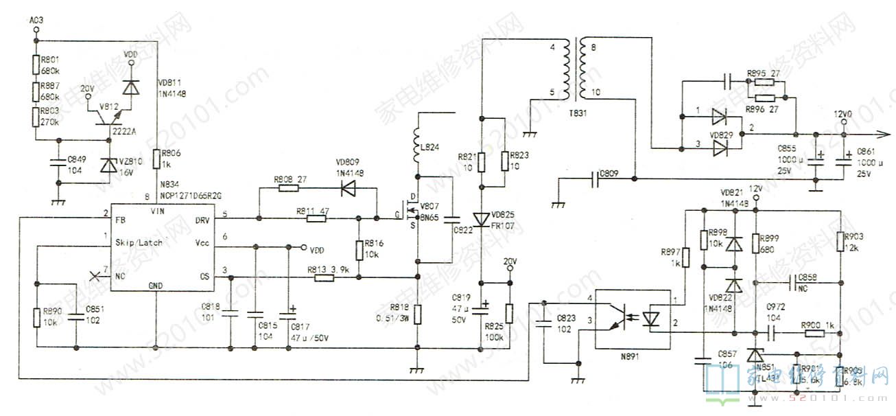 接修一台海信LED50EC590UN液晶电视,故障现象是三无指示灯不亮。该机采用RSAG7.820.5687电源板,此种型号的电源板在多个机型的机器,上使用,通病是机器工作过程中突然“三无”,查12V整流二极管VD829短路、电源初级20V供电电路中的R821 R823、V812、VZ810一并损坏,其故障根源是12V取样电路中的光耦N891不良所致,应全部更换,如下图1所示。