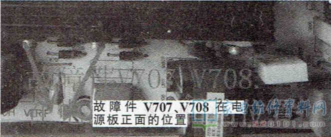 接修一台海信TLM32V68A型液晶电视,电源板号为RSAG7.820.1731/ROH VER.F,开机观看约5分钟后电视慢慢黑屏,伴音正常、无图像。首先打开机壳,把信源插好,上电开机,图声正常,从后面观看背光灯管也亮。用万用表电压挡测量电源板上的M5V、12V、S5V及ON信号电压都正常。在故障出现时,背光灯不亮。电源板各路输出电压仍正常,C810两端的PFC电压仍为正常值398V。断电,测量背光推动变压器T701各脚电阻正常,测二极管VD703~VD708及稳压二极管VZ701~VZ706均正常,代换背光控制芯片OZ9938CN后还是不行。怀疑背光功率MOS管V707、V708(型号为5N60C,如图1所示)性能不良,换用IRFS830A型MOS管后,故障排除。
